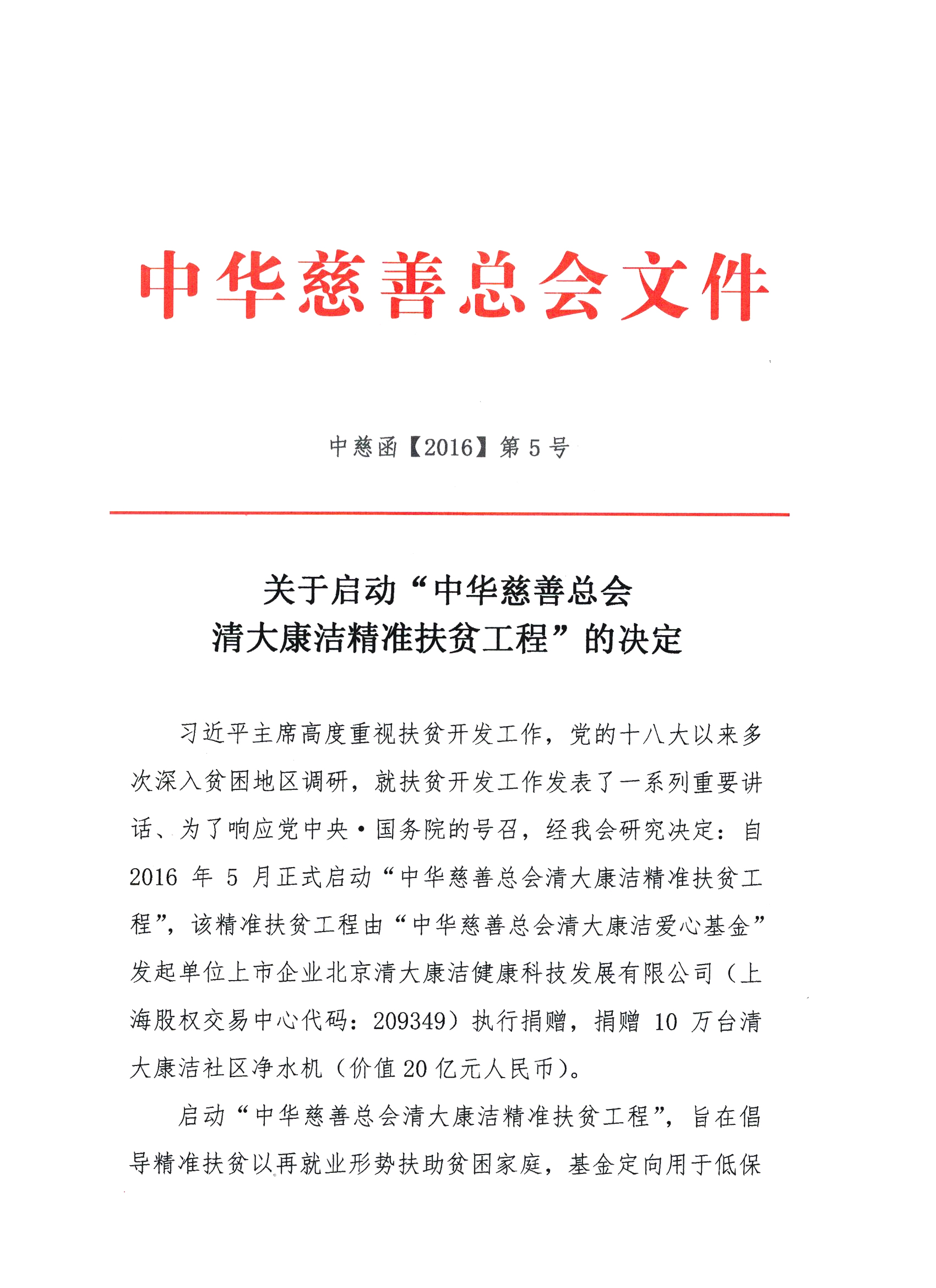 习近平主席高度重视扶贫开发工作,党的十八大以来多次深入贫困地区调研,就扶贫开发工作发表了一系列重要讲话。为了响应党中央·国务院的号召,自2016年5月正式启动“中华慈善总会清大康洁精准扶贫工程”,该精准扶贫工程由“中华慈善总会清大康洁爱心基金”发起,发起单位上市企业北京清大康洁健康科技发展有限公司(上海股权交易中心代码:209349)执行捐赠,“捐赠10万台清大康洁社区净水机(价值20亿元人民币)。
