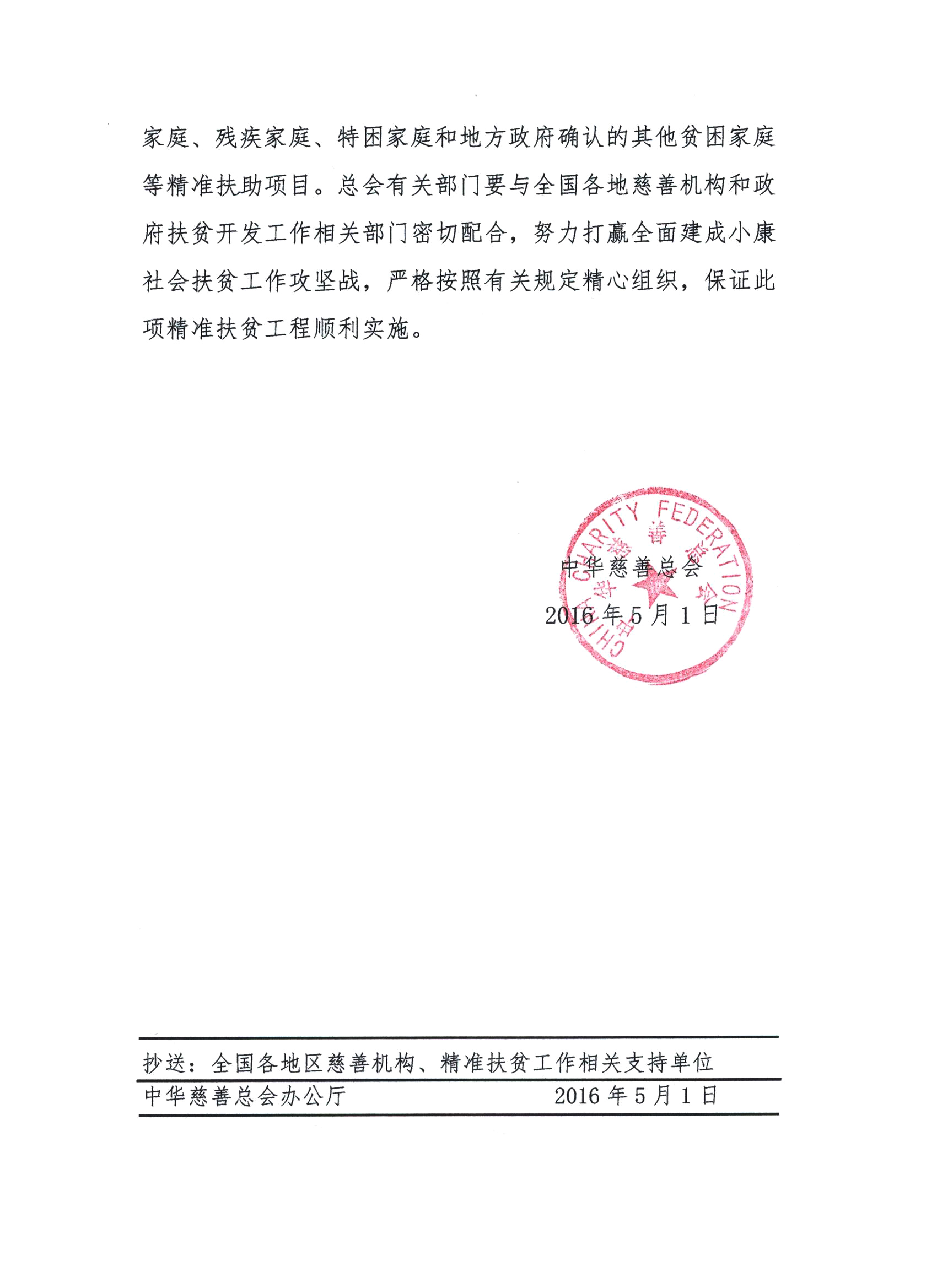 启动“中华慈善总会清大康洁精准扶贫工程”,旨在倡导精准扶贫以再就业形势扶助贫困家庭,基金定向用于低保家庭、残疾家庭、特困家庭和地方政府确认的其他贫困家庭等精准扶助项目。