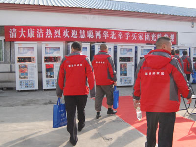 一进入清大康洁的生产基地,慧聪买家团的目光就被院子里摆放的全自动售水机所吸引,迫不及待的参观起来。