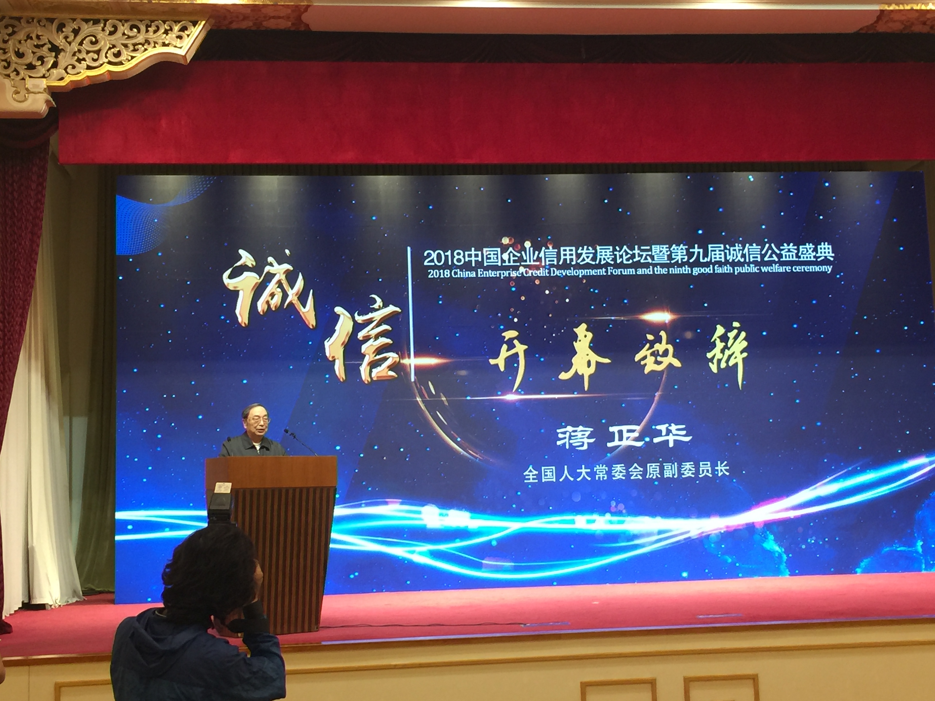 第九届、十届全国人大常委会副委员长-蒋正华宣布2018中国企业信用发展论坛暨第九届诚信公益盛典开幕。中国企业改革与发展研究会常务副会长徐金华,农业部原常务副部长、党组副书记尹成杰、国务院发展研究中心原副主任侯云春上台致辞。国家认监委实验室与检测监管部主任 乔东发表主旨演讲。